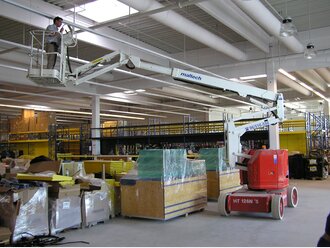 - Teleskopgelenk-Arbeitsbühnen: Durch das Gelenk kann mit diesen Geräten über am Boden befindliche Hindernisse wie Fertigungsmaschinen einfach hinweg gearbeitet werden. Der Korbarm ermöglicht die exakte Positionierung des Arbeitskorbes. Das überzeugende Resultat: mit Teleskopgelenk-Arbeitsbühnen werden selbst schwer zugängliche Punkte erreicht.