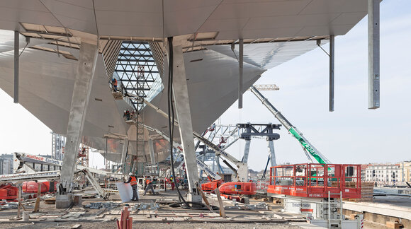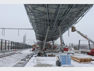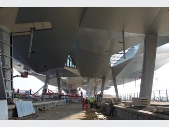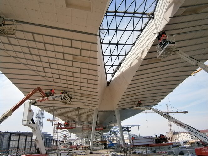 Die Fa. ICC Fassadentechnik war für die Verkleidung sämtlicher Rauten- und Einzelbahndächer verantwortlich. Durch die aufwändige Konstruktion mit schräg liegenden Vielecken und Fugenteilungen über die Länge von 490 Meter und Gesamtbreite des Bahnhofes war die Montage der Verkleidungen eine große Herausforderung. Durch den Einsatz von zahlreichen Teleskop- und Scheren-Arbeitsbühnen konnte die Fläche von 46.000 m² aber perfekt montiert werden und der Bahnhof bekam so sein Gesicht.