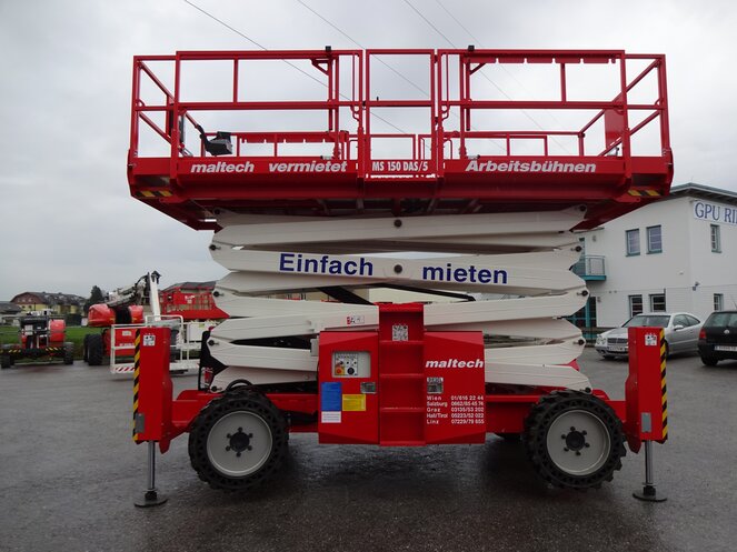 Die MS 150DAS kann mit ihrer besonders großen Plattform bis zu 700 kg Tragkraft auf eine Arbeitshöhe von 15 m heben. Durch zwei Ausschübe kann die Gesamtlänge der Plattform auf über 7 Meter verlängert werden, was z. Bsp. die Montage von langen Fassadenpaneelen ermöglicht. Der kraftvolle Dieselantrieb und die Stollenreifen ermöglichen es auch schwer zugängliche Arbeitsbereiche im Gelände zu erreichen. Dank der selbstnivellierenden Abstützung kann die Bühne auch auf unebenem Untergrund schnell und sicher zum Einsatz gebracht werden.