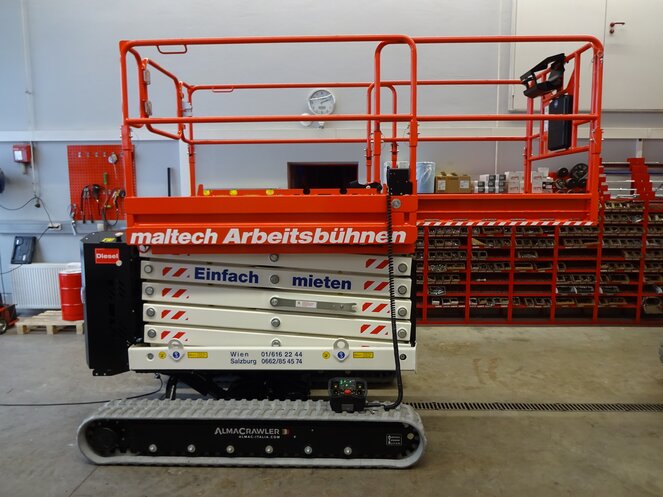 Die kompakte Raupen-Scherenarbeitsbühne MS 100RDE ist mit einem Bi-Leveling-System ausgestattet und ermöglicht sicheres Arbeiten bis 10 Meter Höhe bei einer Tragfähigkeit von 300 kg. Dank automatischer Nivellierung bleibt die Plattform selbst bei Steigungen bis 25° und Querneigungen von 14° waagerecht. Der Diesel- und Elektroantrieb gewährleisten hohe Stabilität sowie eine komfortable Bedienung. Ihre kompakte Bauweise und der 1,12 Meter lange Plattformausschub machen die Bühne besonders flexibel einsetzbar.