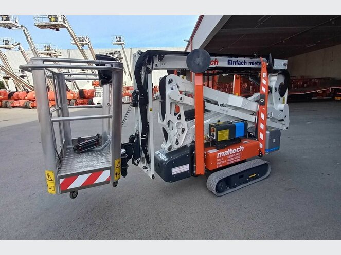 Mit der kompakten MT 153RB erreichen Sie 15,3 m Arbeitshöhe mit 230 kg Tragkraft. Gelenk- und Korbarm ermöglichen die flexible Positionierung des Arbeitskorbes. Die vollhydraulische Abstützung sorgt für unkompliziertes Aufstellen am Arbeitsort. Das Raupenfahrwerk ermöglicht es schwer zugängliche Arbeitsbereiche im Gelände anfahren zu können. Die weißen, abriebfesten Raupenketten hinterlassen auf heiklen Böden keinerlei Spuren und reduzieren den Bodendruck, wodurch auch über bedingt tragfähigen Untergrund wie Wiese gefahren werden kann.