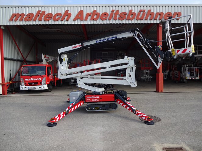 Die MT 170RB erreicht eine Arbeitshöhe von 17 m bei einer maximalen Tragkraft von 230 kg. Der teleskopierbare Gelenkarm ermöglicht Arbeiten über Störkanten und Hindernisse hinweg.Die selbstnivellierenden Klappstützen (Spinnenfüße) gleichen auch starke Bodenneigungen aus und sorgen für einen sicheren Stand.Dank Raupenfahrwerk lassen sich auch schwer zugängliche Arbeitsbereiche im Gelände erreichen. Die weißen, abriebfesten Raupenketten hinterlassen keine Spuren auf empfindlichen Böden und reduzieren den Bodendruck, sodass auch auf bedingt tragfähigem Untergrund wie Wiesen gefahren werden kann.