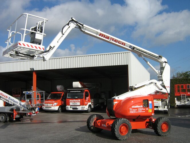 Mit der MT 203DAJ erreichen Sie 20,30 m. Arbeitshöhe bei 230 kg Tragkraft. Durch den Gelenkarm kann spielend leicht über Störkanten und Hindernisse hinweg gearbeitet werden. Der Korbarm ermöglicht dabei eine besonders flexible Positionierung des Arbeitskorbes. Dank kraftvollem 4WD-Dieselantrieb, Stollenreifen und einer Pendelachse ist es möglich auch schwer zugängliche Arbeitsbereiche im Gelände anzufahren. Durch Fahren in voller Höhe können unterschiedliche Arbeitspunkte schnell erreicht werden.