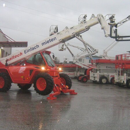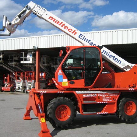 Unsere geländegängigen Teleskopstapler sind bis zu einer Hubhöhe von 25 Metern erhältlich. Die maximale Traglast beträgt zwölf Tonnen, die höchste Reichweite 21 Meter. Alle Rotor-Teleskopstapler sind mit ihren Abstützungen mehr als 360 Grad drehbar.