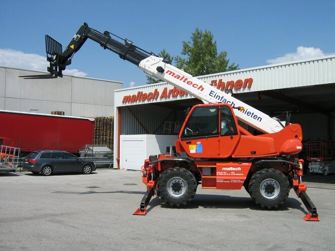 Der drehbare Teleskopstapler MTS 50.21R kann bis zu 5 Tonnen befördern und hebt Material oder Waren auf 20,4 Meter. Die Lasten können 18 Meter nach vorne austeleskopiert und der Oberwagen endlos im Kreis geschwenkt werden, wodurch Sie den Stapler in Kombination mit diversen Anbauteilen wie einen Mobilkran nutzen können. Dank selbstnivellierender Stützen kann auf unebenem Untergrund gearbeitet, und die Reichweite auf ein Maximum erhöht werden. Allradlenkung und Allradantrieb sorgen für eine hohe Manövrierfähigkeit und problemloses Fahren auch in unwegsamem Gelände. Mit dem Hundegang kann das Gerät seitlich versetzt werden ohne dabei auszuscheren.
