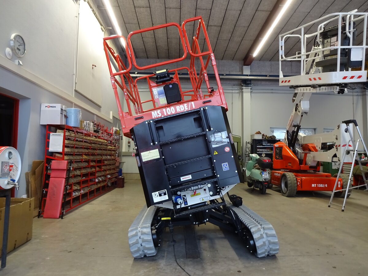 Die automatische Nivellierung hält die Plattform selbst auf Steigungen bis 25° und Querneigungen von 14° immer waagerecht, was die Handhabung besonders einfach und sicher macht. Dank der kompakten Bauweise ist die MS 100RDE ideal für enge Arbeitsbereiche, während der Plattformausschub von 1,12 m zusätzlichen Raum für Arbeiten bietet.