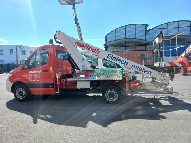 Mit dem leichten, kompakten MTG 17,7 können Sie mühelos mit 300 kg Tragkraft eine Arbeitshöhe von 17,70 m erreichen. Dank der automatischen Abstütz-Nivellierung kann das Gerät auch auf unebenem Untergrund einfach, schnell und sicher zum Einsatz gebracht werden. Der komfortable Mercedes Sprinter darf mit dem „normalen“ B-Führerschein gelenkt werden. Auf der Ladefläche kann Material zum Einsatzort mitgenommen werden. Durch den einfachen Aufbau (nur Teleskop) kann der Korb rasch in die gewünschte Arbeitsposition gebracht werden.