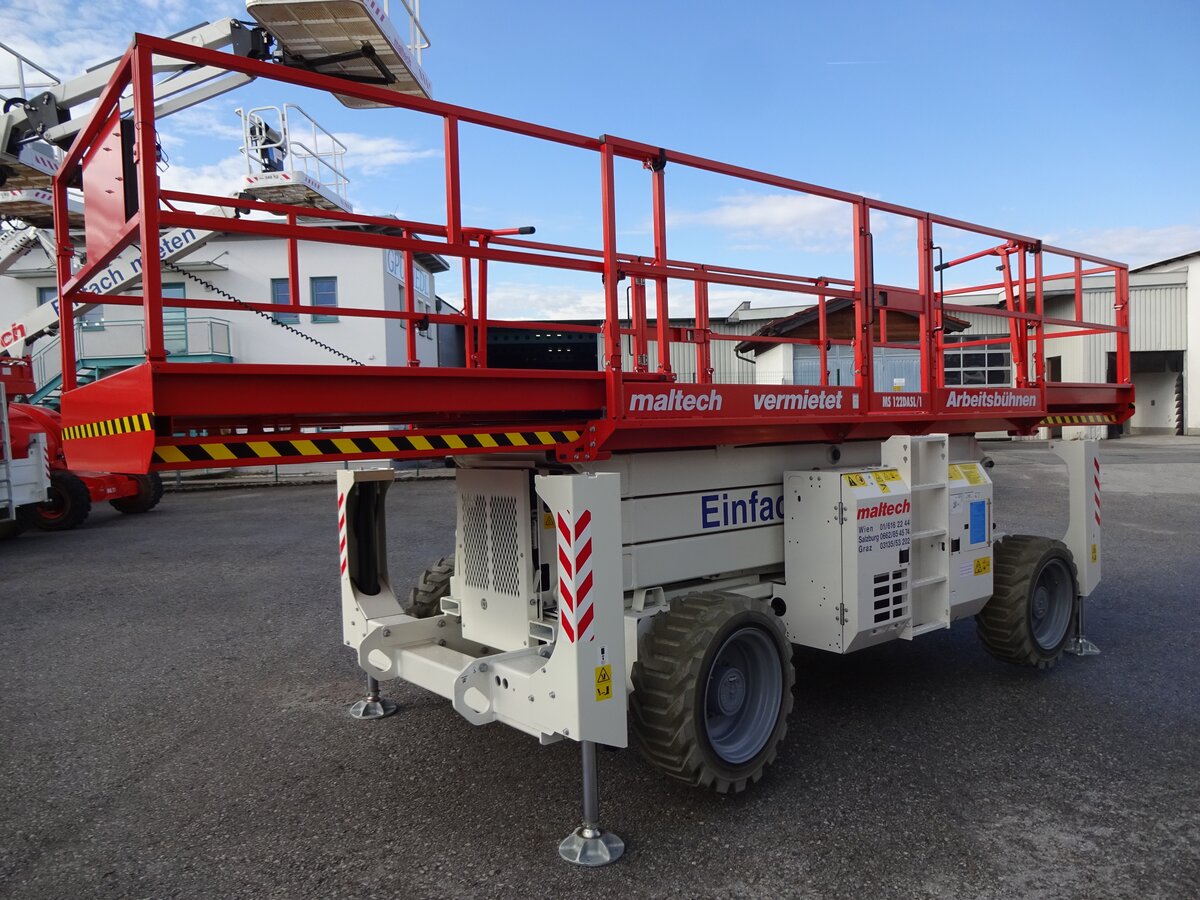 Die MS 122DASL kann mit ihrer besonders großen Plattform bis zu 1.134 kg Tragkraft auf eine Arbeitshöhe von 12 m heben. Durch zwei Ausschübe kann die Gesamtlänge der Plattform auf über 7,30 Meter verlängert werden, was z. Bsp. die Montage von langen Fassadenpaneelen ermöglicht. Der kraftvolle Dieselantrieb und die Stollenreifen ermöglichen es auch schwer zugängliche Arbeitsbereiche im Gelände zu erreichen. Dank der selbst nivellierenden Abstützung kann die Bühne auch auf unebenem Untergrund schnell und sicher zum Einsatz gebracht werden.