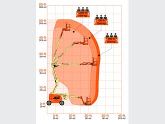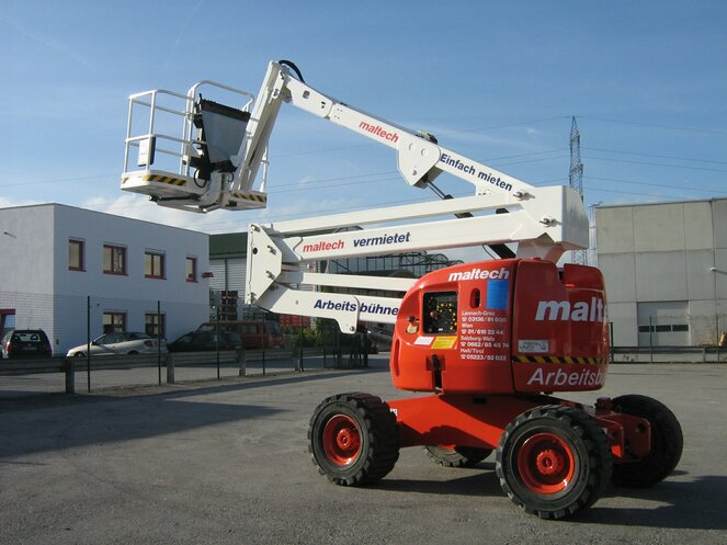 Durch den Gelenkarm kann spielend leicht über Störkanten und Hindernisse hinweg gearbeitet werden. Der Korbarm ermöglicht dabei eine besonders flexible Positionierung des Arbeitskorbes. Dank kraftvollem 4WD-Dieselantrieb, Stollenreifen und einer Pendelachse ist es möglich auch schwer zugängliche Arbeitsbereiche im Gelände anzufahren. Durch Fahren in voller Höhe können unterschiedliche Arbeitspunkte schnell erreicht werden.