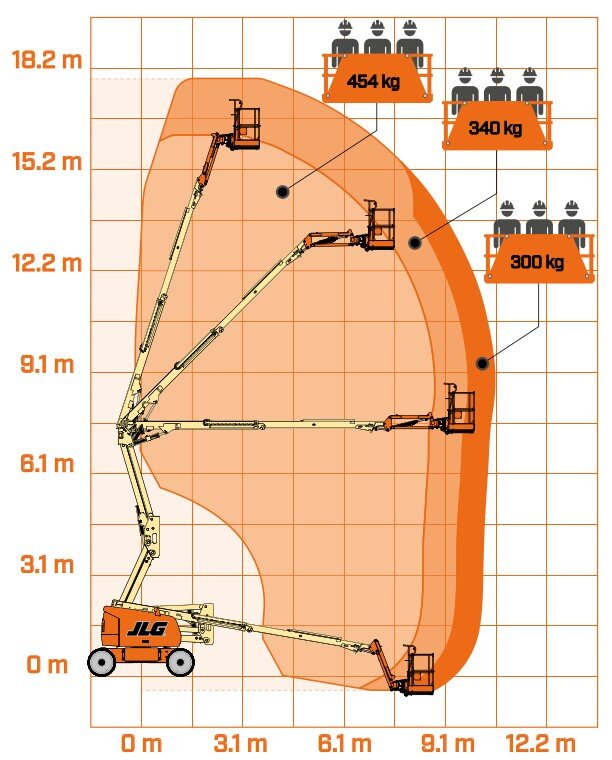 Mit der MT 180DAJ erreichen Sie 18,00 m. Arbeitshöhe bei 454 kg Tragkraft. Durch den Gelenkarm kann spielend leicht über Störkanten und Hindernisse hinweg gearbeitet werden. Der Korbarm ermöglicht dabei eine besonders flexible Positionierung des Arbeitskorbes. Dank kraftvollem 4WD-Dieselantrieb, Stollenreifen und einer Pendelachse ist es möglich auch schwer zugängliche Arbeitsbereiche im Gelände anzufahren. Durch Fahren in voller Höhe können unterschiedliche Arbeitspunkte schnell erreicht werden.